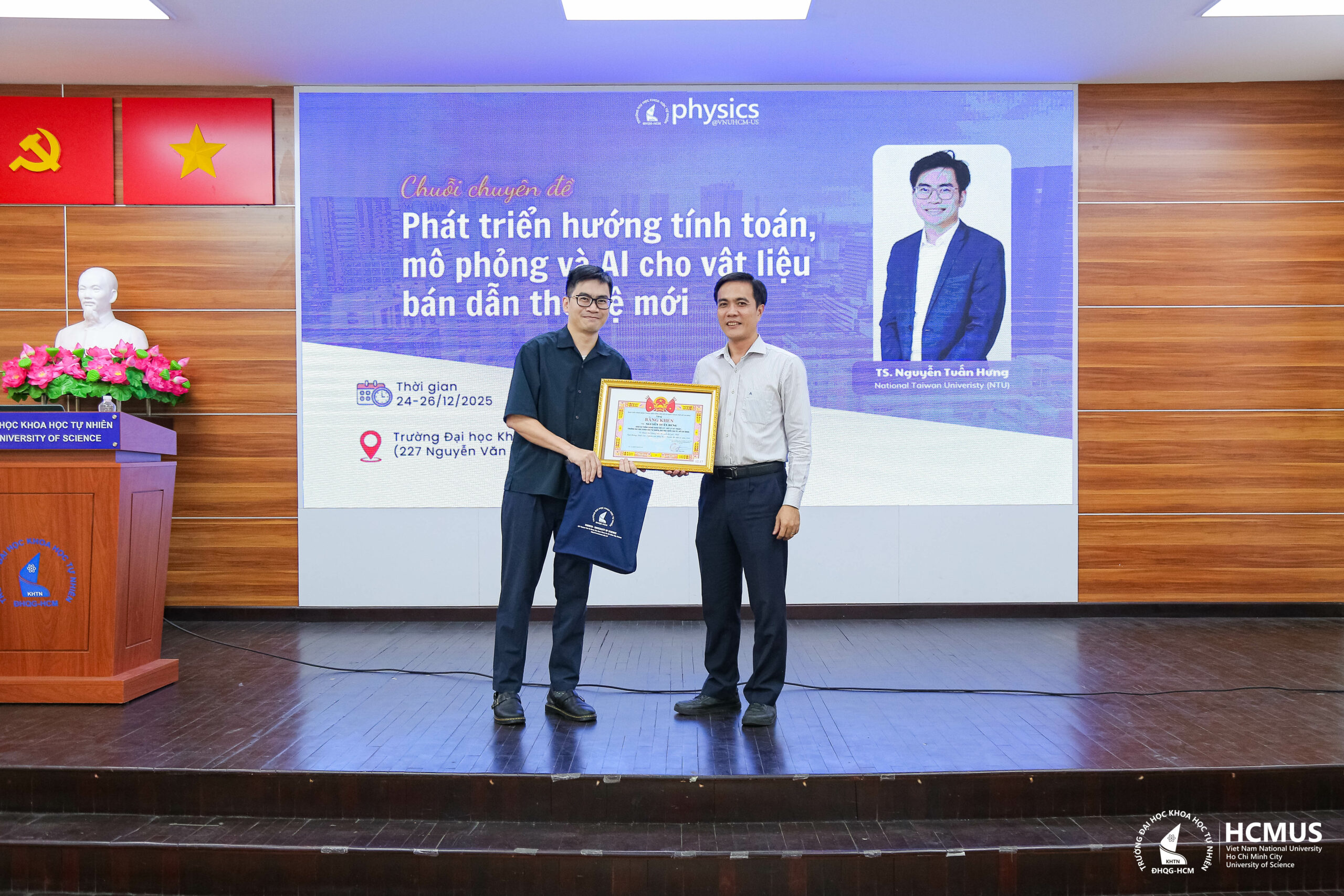 For details, please visit the website: https://hcmus.edu.vn/chuoi-chuyen-de-hoc-thuat-mo-huong-tiep-can-tinh-toan-va-ai-trong-nghien-cuu-vat-lieu-ban-dan-the-he-moi/ and https://hcmus.edu.vn/chuong-trinh-seminar-khoa-hoc-cung-nha-khoa-hoc-tre-tai-nang-ts-nguyen-tuan-hung/